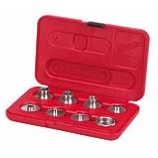 Complete selection of the most popular router template guides. Kit includes seven individual guides (models 49-54-0710, -0715, -0720, -0725, -0730, -0735, -0740), two lock-nuts (44-40-0140) and a durable plastic carrying case. Each guide is constructed from precisely machined steel for years of reliable, accurate, rust-free template or pattern routing. The universal, lock-nut (1-3/16 in. center hole) design fits Milwaukee and most other popular routers when equipped with a 1-3/16 in. center hole sub-base (Milwaukee router models 5615, 5616, and 5619 with 1-3/16 in. center hole sub-base model 49-54-1040; Milwaukee router model 5625 with 1-3/16 in. center hole sub-base model 49-54-1026).