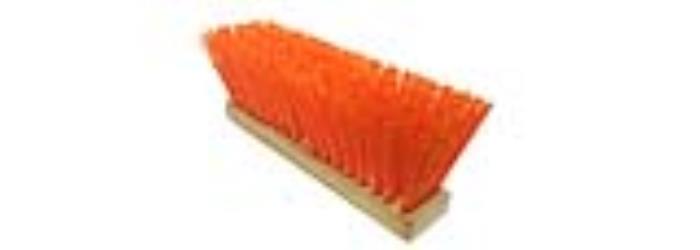 Magnolia Brush's OSHA heavy gauge street broom filled with OSHA orange poly corn for high visibility use. Durable long lasting plastic will outlast natural fibers. Will not absorb odors, mildew, rot or discolor. Will not absorb water and rinses clean. Wide flare on ends allows close sweeping to curbs. Recommended use: for wet or dry sweeping where a rugged broom is required on rough surfaces such as concrete or asphalt street gutters, dairy barns, highway construction, etc. Requires standard tapered handle (handle not included). 16-inches hardwood block and 5-inches trim. Orange bristles.